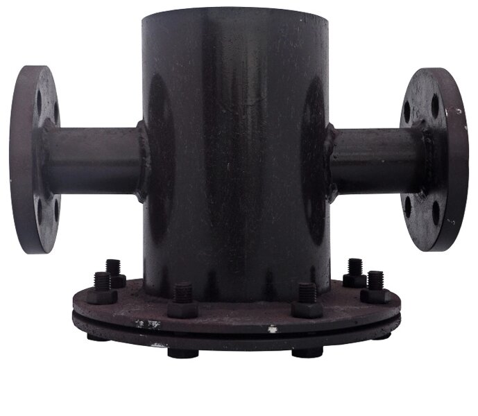 Грязевик — узел расширения трубопровода с входным и выходным патрубками. Внутри корпуса располагается сетка для фильтрации воды, а на выходе — люк для очистки или замены сетчатого фильтра.
